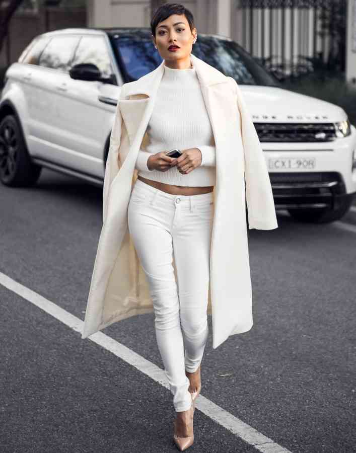 Pentru a ne asorta cu peisajul de iarnă, purtați tendința alb. La fel ca bloggerița de modă Mica Gianneli, am putea începe cu blugi, top cu guler și palton pentru a face totul confortabil și relaxat. Pentru un aspect mai sofisticat, alege sacouri structurate și pantaloni care arată perfect cu un rucsac din piele șic și tocuri.