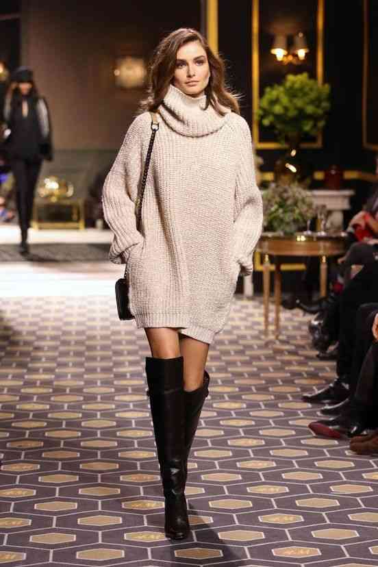* Un pulover oversized purtat ca rochie şi o pereche de cizme înalte