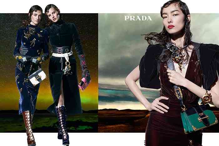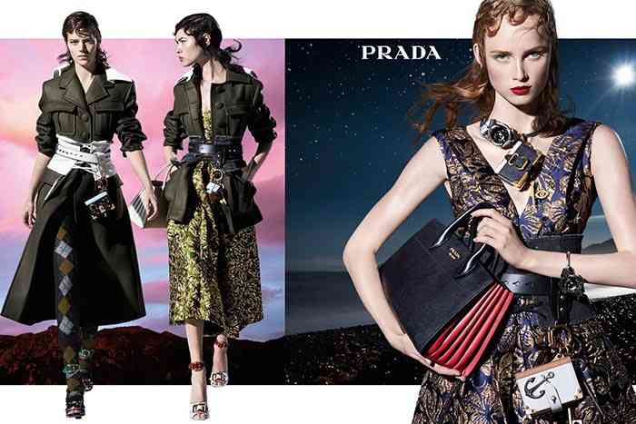 Pentru a spori stilul eclectic, dar destul de minimalist al liniei (Miuccia într-adevăr, s-a întrecut pe sine cu această ultimă colecție a ei), Steven Meisel arătându-și abilitățile sale de a lucra cu colaje dramatice pe care le-a catapultat direct în spațiul fictiv, cu nopți înstelate și scenarii amurg care domină fundalurile. Dat fiind faptul că această colecție a fost inspirată de călătorie, campania Prada pentru toamna / iarna 2016-2017 tocmai a luat această metaforă la extrem, literalmente ilustrând cele 27 de modele.