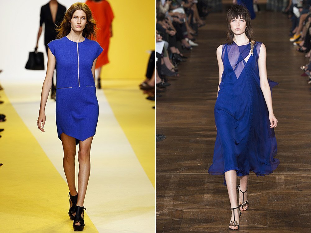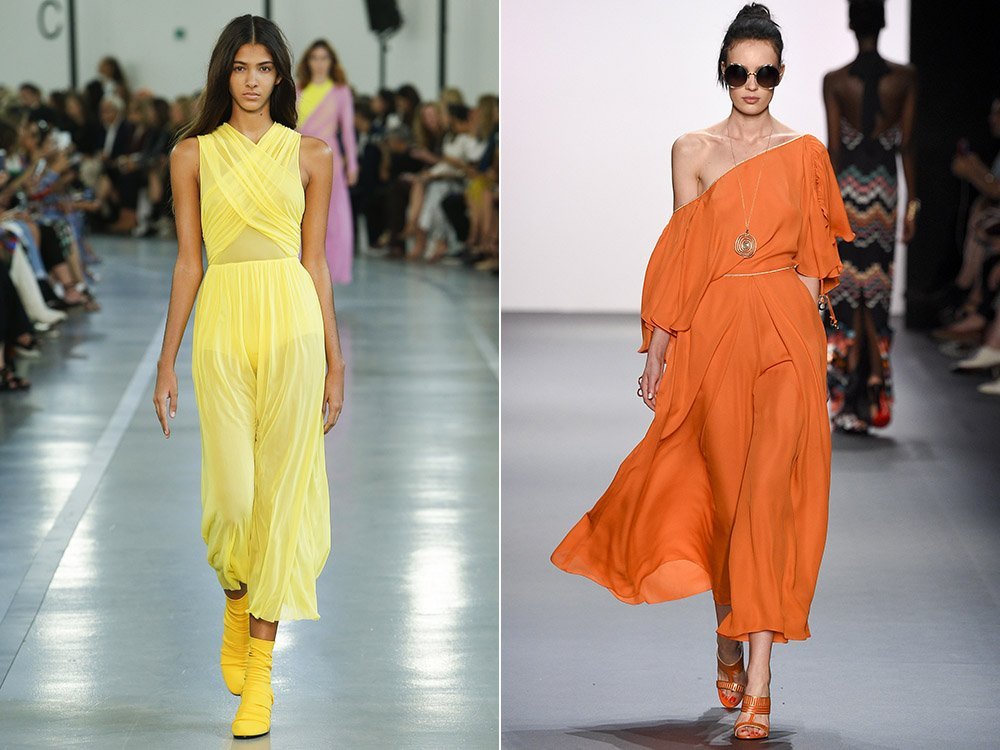 Esсada, Lanvin, Prabal Gurung s-au bazat pe albastru închis, care în acest sezon este prezentat de nuanța „Albastru Lapis”. Lipsa de elemente decorative și siluete simple pe rochii arată frumos, prevăzute cu nuanța profundă de albastru. Portocaliu și galben sunt alte culori la modă în sezonul de primăvară-vară 2017. Emilio Pucci, Jenny Packham, Lacoste au prezentat rochii monocrome în nuanțe suculente și însorite.