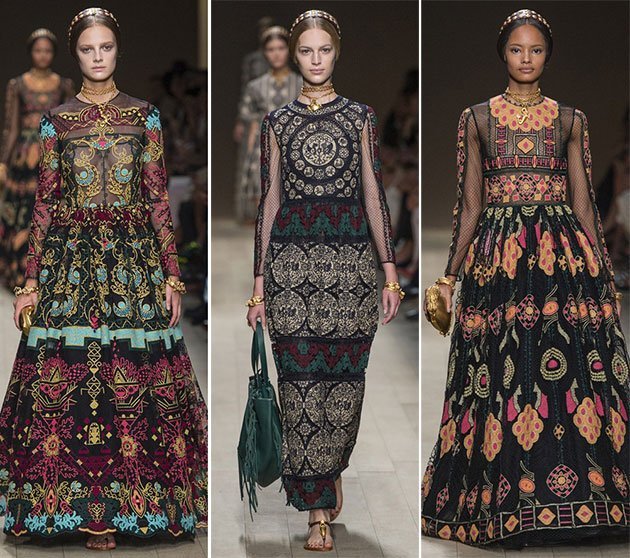 1: Imprimeuri etnice: motivele etnice, cum ar fi imprimeurile aztece si imprimeurile tribale, au fost prezente in toate cele patru capitale de moda nu numai in ceea ce priveste imprimeurile, ci si desenele. Multi designeri au creat piese de imbracaminte inspirate din Est, in timp ce imprimeurile etnice devin cea mai buna cale de a adopta noua tendinta. Imprimeurile etnice unice au fost prezentate de Dolce & Gabbana si Isabel Marant.