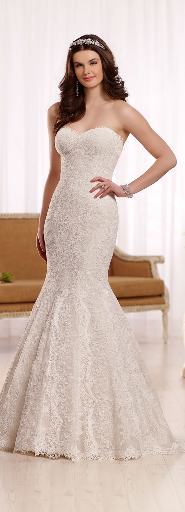Cu o sculptura din dantela care o transforma intr-o piesa de vis pentru mirese, aceasta rochie cu o cadere moale poate fi castigatoarea in cautarea ta, (979 euro)