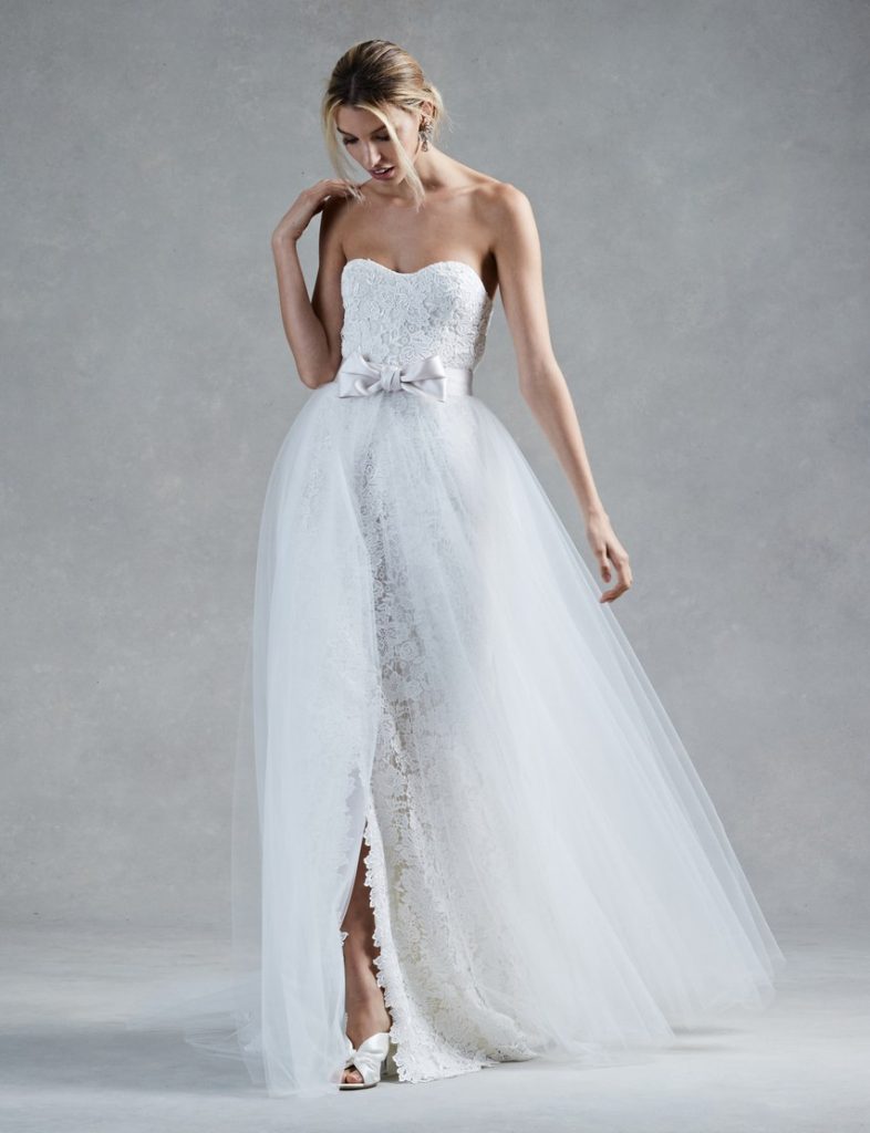 Incepem cu acest design de rochie de mireasa plina de romantism, rochia Harlow a lui Oscar de la Renta este un vis. Un corset cu un strop de iasomie ghipura, un decolteu cu inima si o fusta curata, larga, care se inchide in talie cu o funda frumoasa si eleganta din satin.