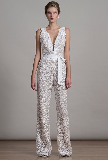 O centura cu funda este tusa finala a acestei salopete din dantela Liancarlo cu un decolteu deschis care accentueaza talia. Finisat intr-o usoara fanta, acest look de mireasa la moda este inspirat de vibratia anilor 70 si te va face o mireasa atat de diferita.