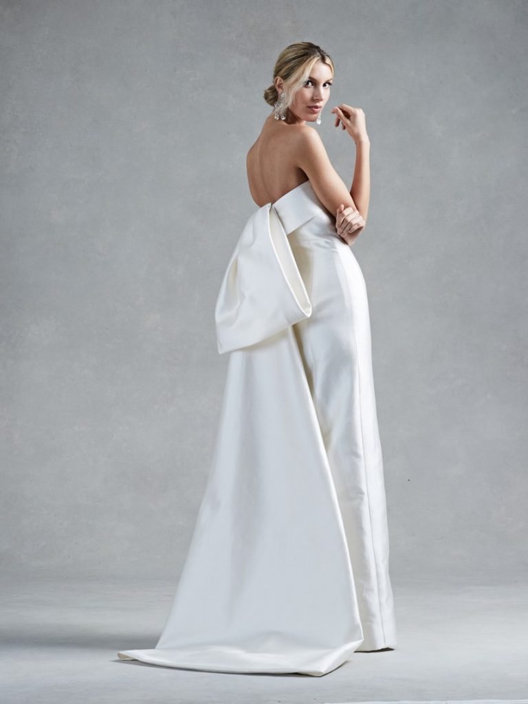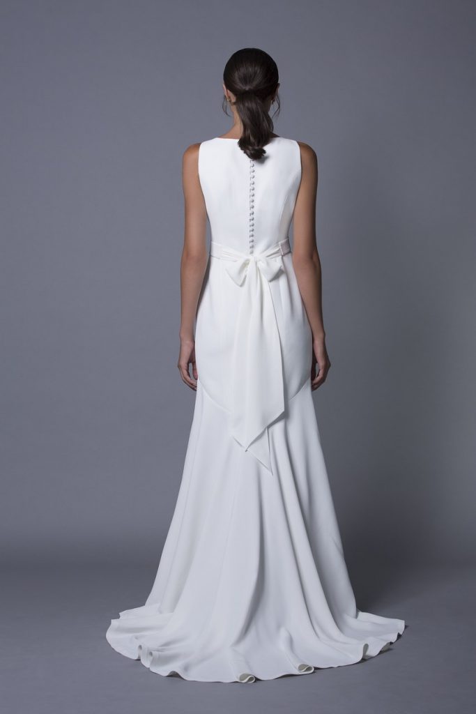 O rochie coloana din crepon are o senzatie Art Deco hotarata, cu decolteul sau adanc indraznet. O astfel de selectie va satisface orice mireasa.