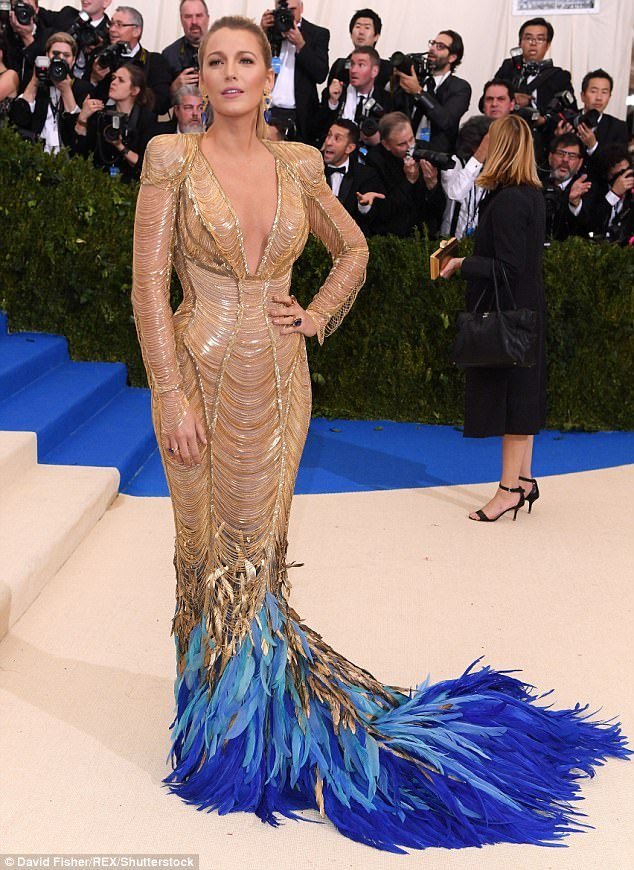 Fata „Gossip Girl”, Blake Lively, a purtat o rochie aurie extravagantă semnată Atelier Versace. Rochia are designul flăcării albastre cu pene în trenă și lanțuri de aur de-a lungul întregii rochii.