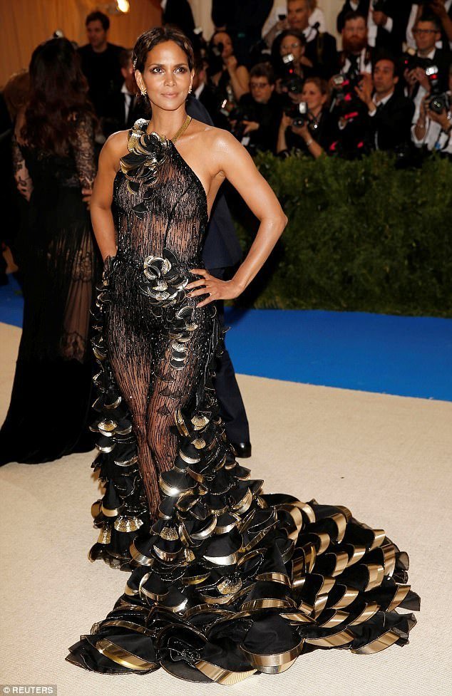 Halle domina la prima ei noapte la Met Gala. A purtat o rochie neagră transparentă, cu detalii florale dramatice de argint și negru și trenă. Creația este realizată de Comme des Garcons.