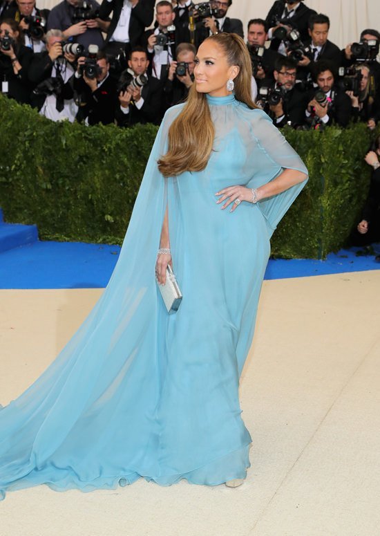 Jennifer Lopez nu a experimentat într-adevăr cu look-ul ei în acest an. A decis să facă senzație într-o rochie albastră de vis semnată Valentino. Jennifer a completat aspectul cu o coafură voluminoasă și un dermatograf dramatic cu codițe.