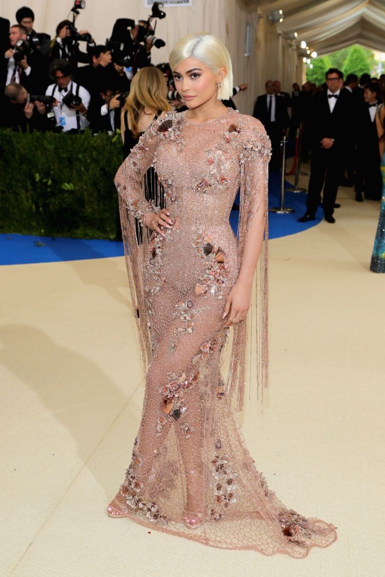 Rochia nude a lui Kylie, proiectată de Donatella Versace, a reprezentat un moment de debut. Rochia nude prezintă detalii florale și franjuri drastice de-a lungul brațelor.
