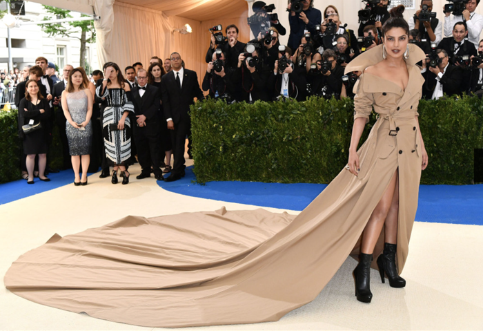 Priyanka este îmbrăcată într-o rochie Ralph Lauren personalizată. Trena ei este atât de lungă încât are nevoie de asistență pentru a merge pe scări.Trenciul neobișnuit de îmbrăcăminte a primit o aprobare din partea criticilor de modă.