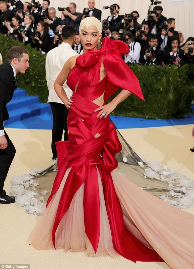 Rita a fost fără teamă în alegerea ei în acest an. Ea a dominat covorul roșu cu o rochie voluminoasă, îmbrăcată cu panglică de mătase semnată Marchesa. Funda supradimensionată la umăr a făcut o declarație mai puternică. Rita a completat aspectul cu cercei diamant Lorraine Schwartz în valoare de 3 milioane de dolari!