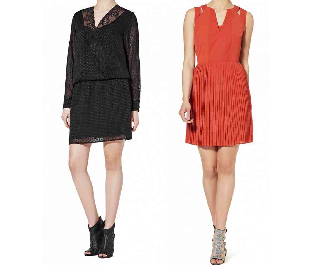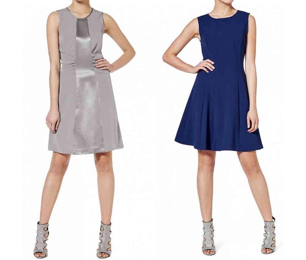 Foarte chic, această rochie din satin cu banda centrală din satin gri perlă (€ 79.95) și rochia albastră de-a dreptul dezinvoltă până deasupra genunchiului, cu insspirație din anii ’50 (costă € 59.95).