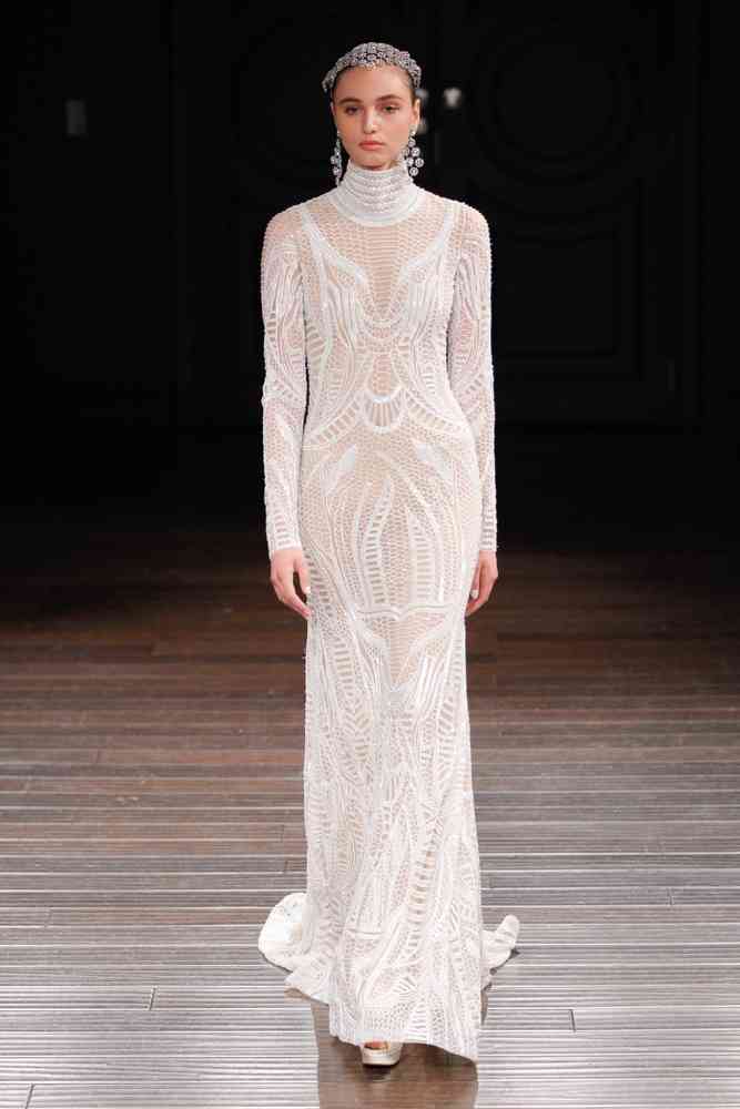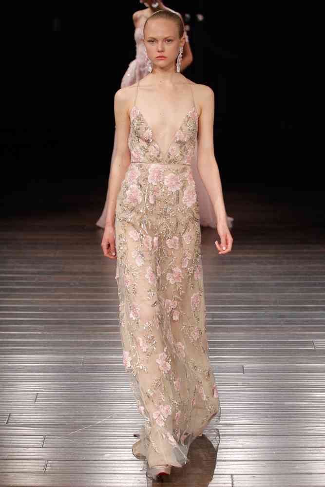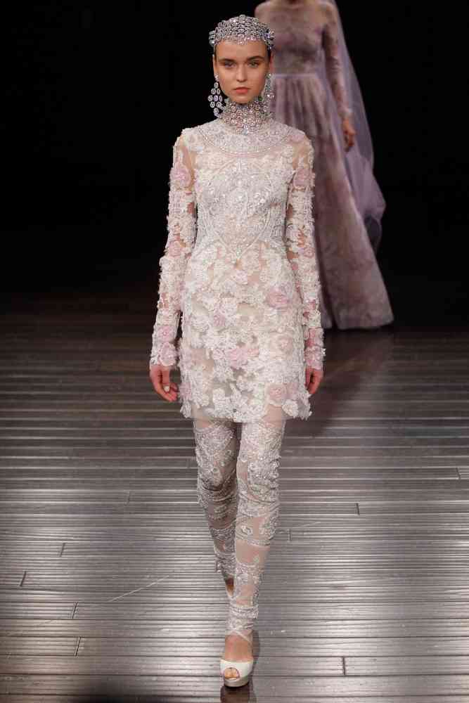 Broderii florale și motive Paisley împodobesc unele dintre rochii, dovedind că nu este neapărat necesar pentru a opta pentru o rochie total albă pentru a face ziua nunții unică și specială. Ca de obicei, Khan luptă împotriva normelor convenționale, contribuind în același timp, de asemenea, să schimbăm regulile modei tradiționale care aduc mai departe un alt fel de eleganță. Accente fildeș și aurii completează cele mai multe propuneri, ca să nu mai vorbim de cascadele înfloritoare de pietre, pene și aplicațiile paillette care dau cu adevărat un sens modei.