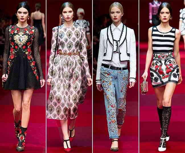 Colecția Dolce & Gabbana pentru primăvara/vara 2015 a fost inundată cu tehnici inovatoare de croitorie, ornamente grele și forme neconvenționale, desene și modele, toate puse în tonuri de roșu și negru iconic, care sunt aproape întotdeauna prezente în colecțiile brandului. Așa cum era de așteptat, am văzut toate vibrațiile și caracteristicile de stil ale mărcii italiene caracteristice, inclusiv dantelă dramatică, încălțăminte și genți, precum și articole de îmbrăcăminte demne de o regină care invadează instantaneu în visele și fanteziile cuiva. În conformitate cu aceasta, această colecție specifică s-a remarcat cu influența culturală, aducând o mulțime de modele inspirate din coridele spaniole (sau luptele cu tauri, așa cum o puteți cunoaște mai bine), și flamenco că a lăsat un semn vieții locale din Sicilia. Acolo am putea observa, de asemenea, motivele gypsy, cum ar fi acele franjuri și șaluri îndrăznțe care vin cu rochii mini imprimate.
