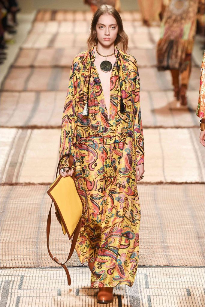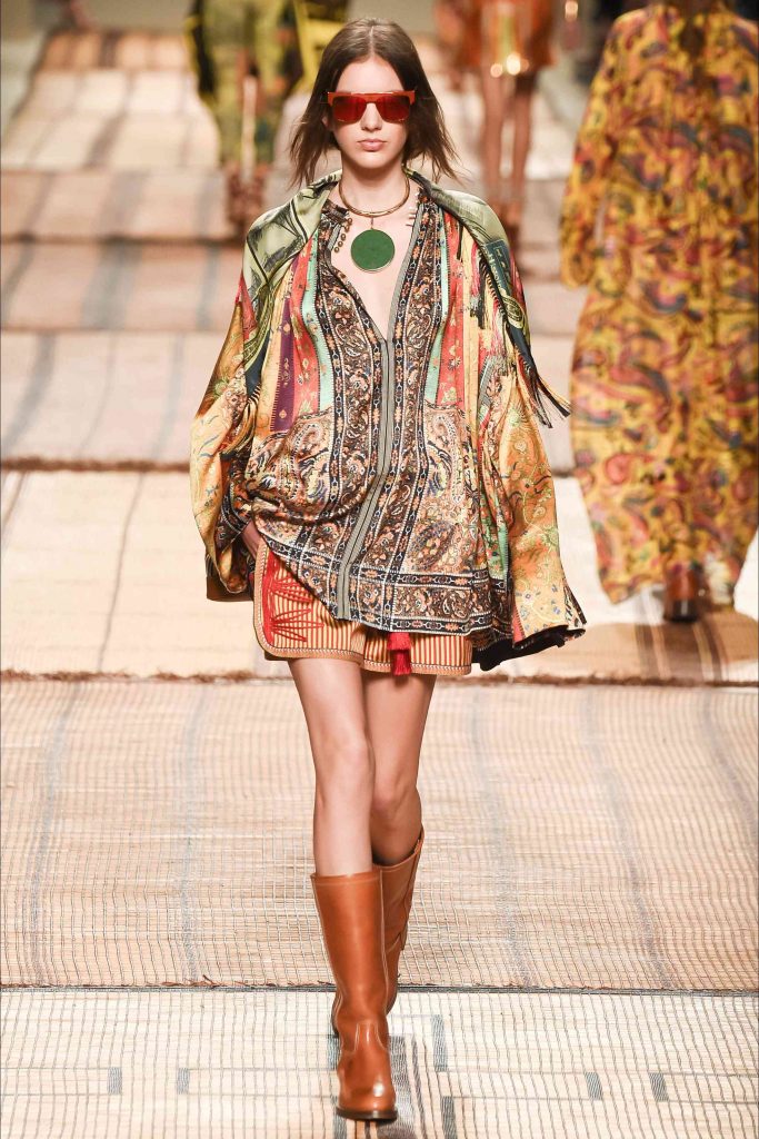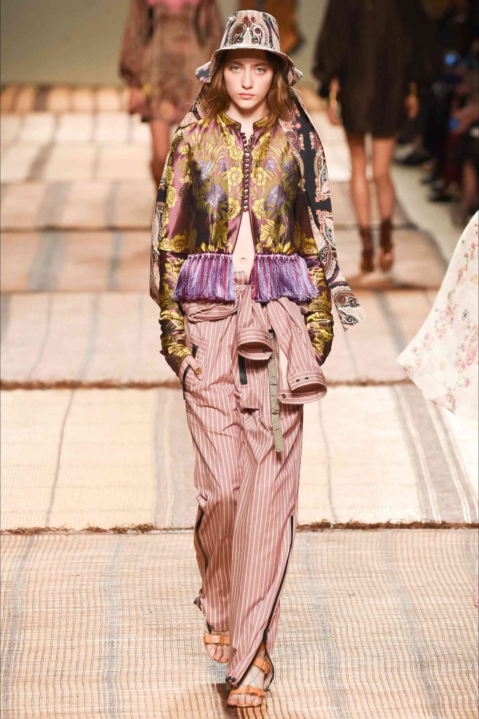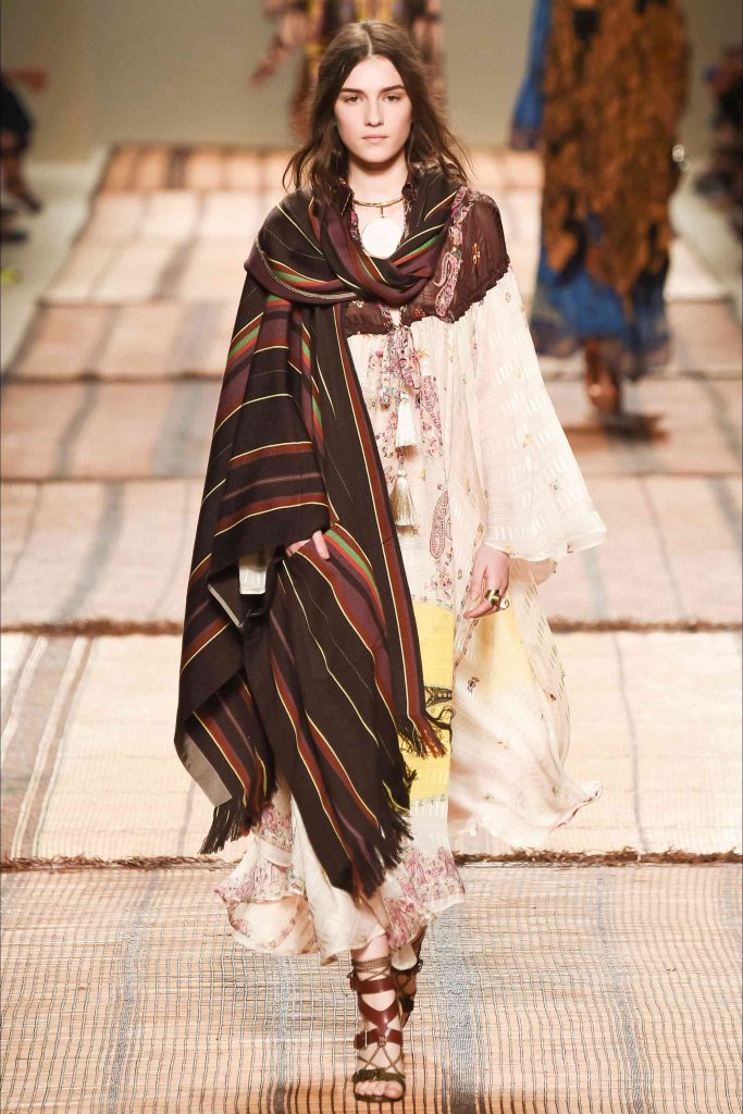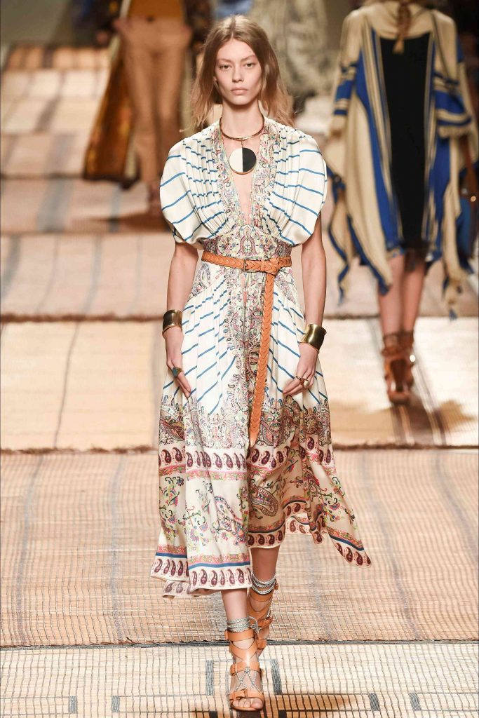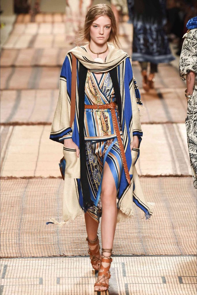 Modelele, precum călătoriile neobosite invadează pista Etro. Pentru această colecție, Veronica Etro a vrut să reinterpreteze moștenirea brandului în lumina de astăzi. Dedicată triburilor urbane, colecția Etro primăvară-vară 2017, este un amestec cu un suflet pop, unde chimonourile cu dungi, capele, rochiile mici boeme, caftanele lungi și poncho-urile etnice coabitează, și au gust de libertate și aventură.