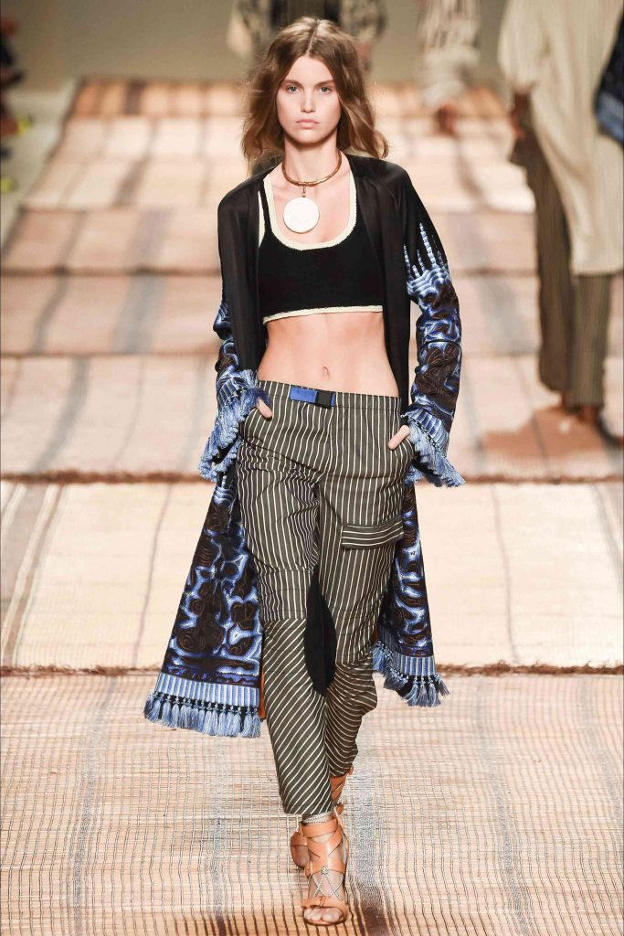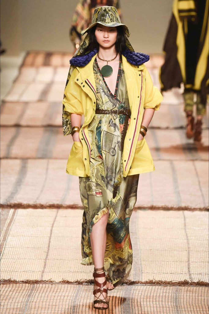 Romantică și practică, colecția Etro pentru primăvara / vara 2017 este prinsă între două lumi diferite, dar reușind întotdeauna să ne dea ce e mai bun din ambele. Caftane maxi sunt asociate fie cu pantaloni scurți maxi confortabili sau rochii, în timp ce paltoanele și gențile practice sunt însoțite de buzunare suficient de mari pentru a fi umplute cu creioane, sau chiar baloane, care s-au asociat cu hainele liniei.