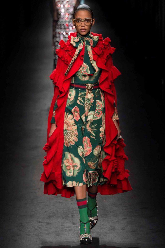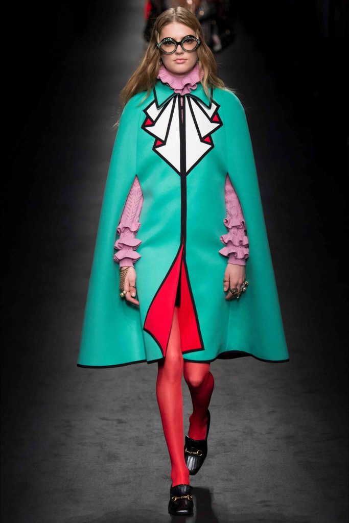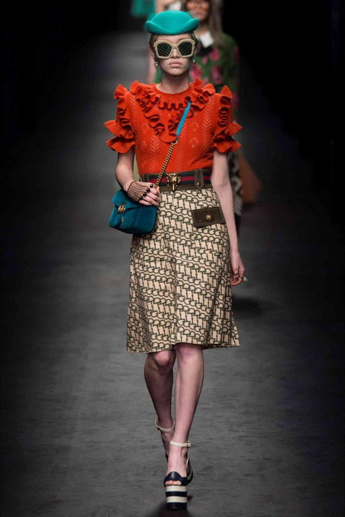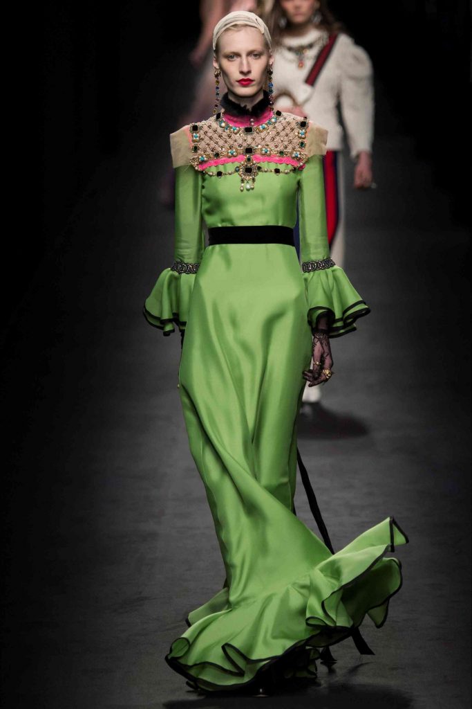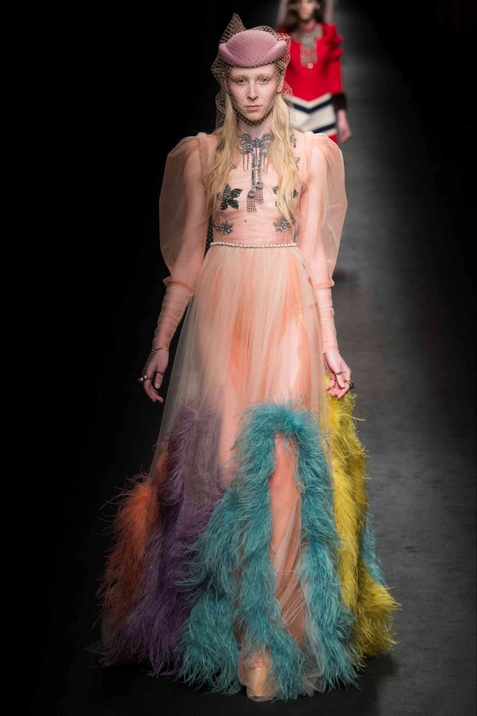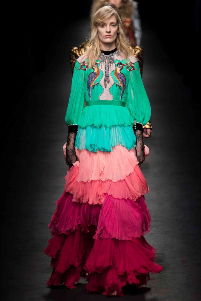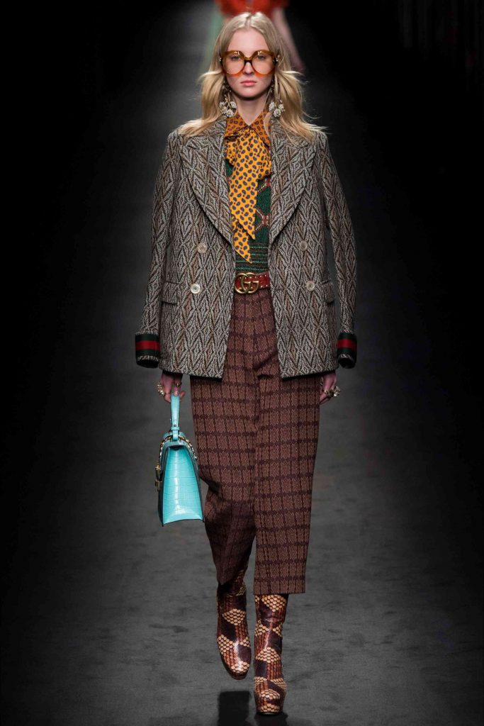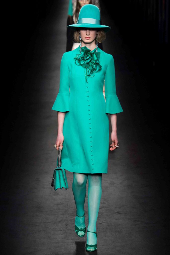 În cea mai recentă colecție Gucci, Alessandro Michele, designerul casei de modă, face unele referiri la anii ’40, precum și trecerea de la anii ’70 la ’80. În mod tradițional, colecția este dedicată sufletelor curajoase. Cea mai îndrăzneață opțiune de culoare a explodat pe podiumul de prezentare, cum ar fi aspectul turcoaz din cap până în picioare. În această colecție, Michele a salvat elementele sale introduse anterior în ADN-ul Gucci.