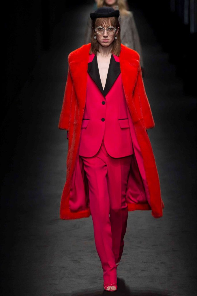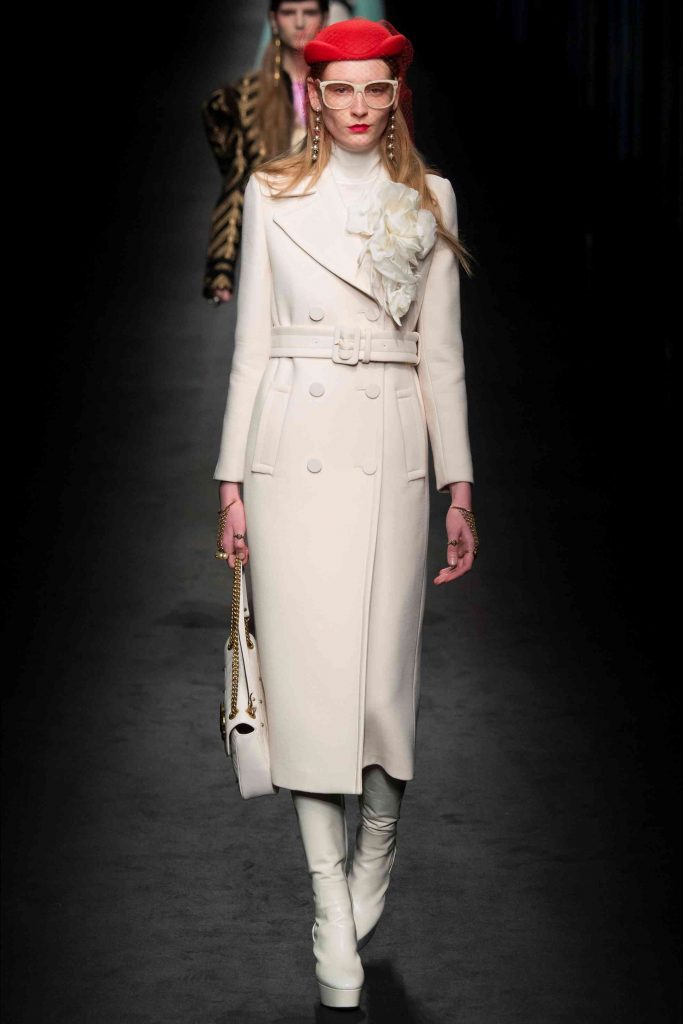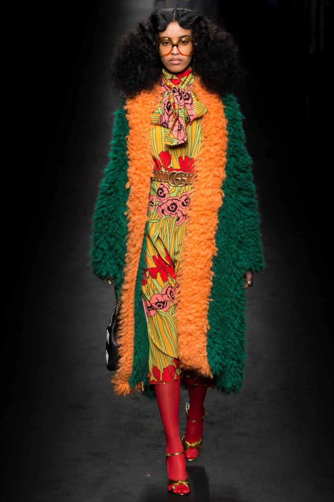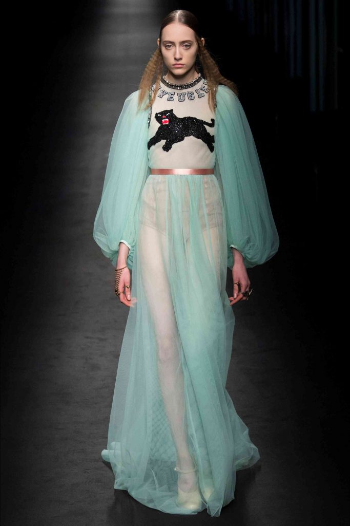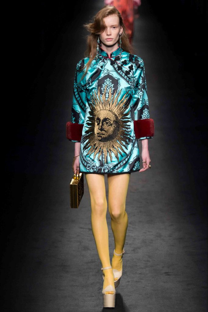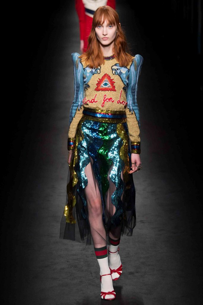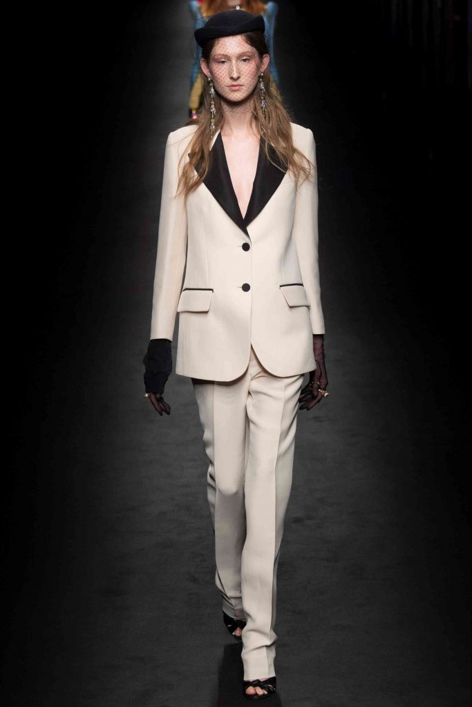 În cea mai recentă colecție Gucci, Alessandro Michele, designerul casei de modă, face unele referiri la anii ’40, precum și trecerea de la anii ’70 la ’80. În mod tradițional, colecția este dedicată sufletelor curajoase. Cea mai îndrăzneață opțiune de culoare a explodat pe podiumul de prezentare, cum ar fi aspectul turcoaz din cap până în picioare. În această colecție, Michele a salvat elementele sale introduse anterior în ADN-ul Gucci.