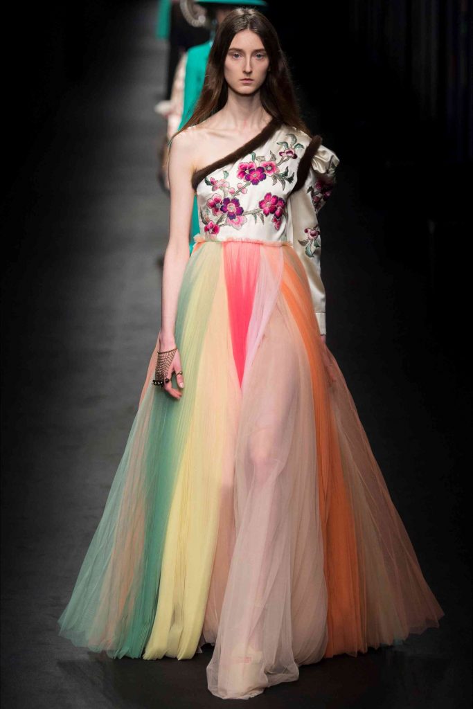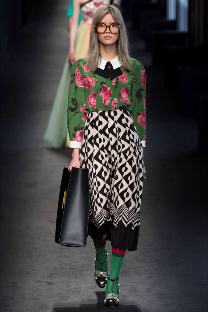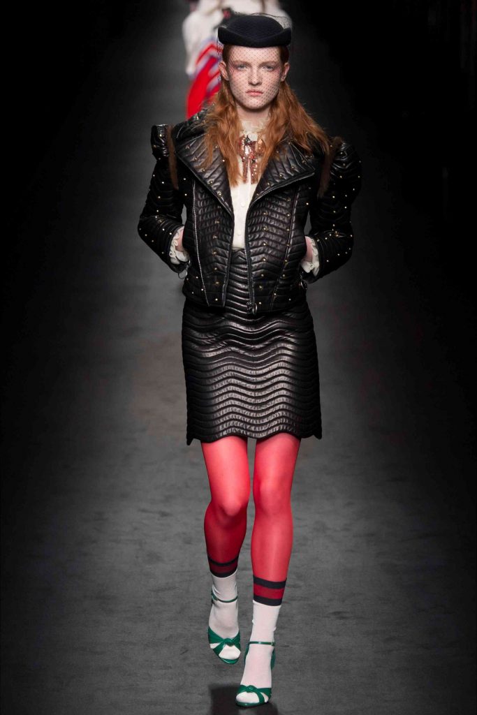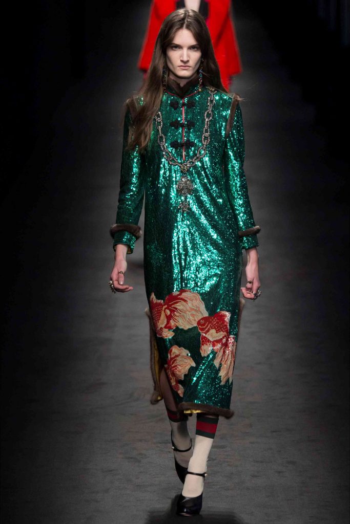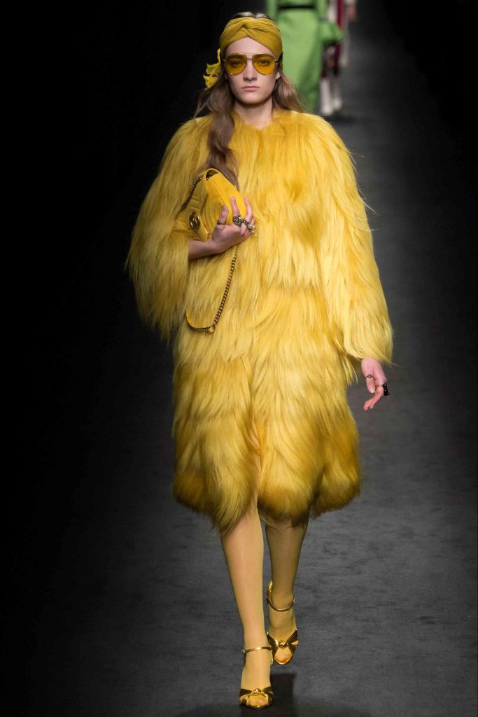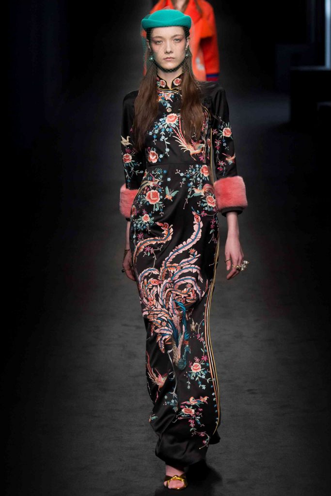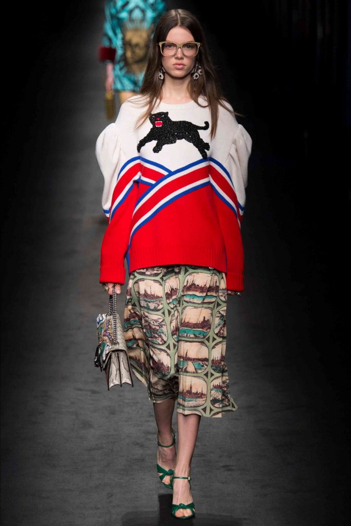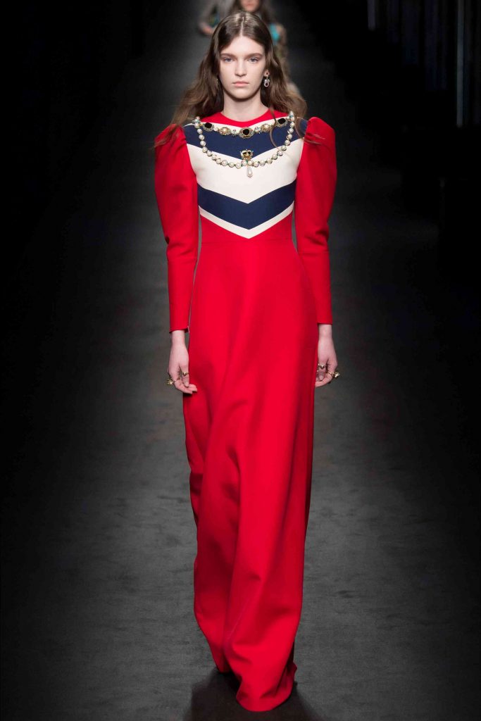 În cea mai recentă colecție Gucci, Alessandro Michele, designerul casei de modă, face unele referiri la anii ’40, precum și trecerea de la anii ’70 la ’80. În mod tradițional, colecția este dedicată sufletelor curajoase. Cea mai îndrăzneață opțiune de culoare a explodat pe podiumul de prezentare, cum ar fi aspectul turcoaz din cap până în picioare. În această colecție, Michele a salvat elementele sale introduse anterior în ADN-ul Gucci.