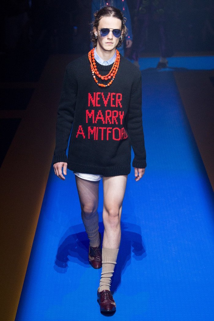 Logomania lui Alessandro este in intreaga colectie de primavara / vara 2018. Designerul a imbunatatit logo-ul Gucci pentru toti admiratorii sai loiali, care iubesc sa plateasca un omagiu marcii prin hainele pe care le poarta. Designerul a creat piese inspirate de prieteniile sale recente. In onoarea lui Elton John, a fost un costum cu broderie muzicala, sacou purpuriu cu paiete de sarpe si o jacheta cu pom-pom. Ideea pentru puloverul „nu te casatori cu un Mitford” a venit din prietenia lui Alessandro cu ducele si ducesa din Devonshire, unde Gucci a sponsorizat extravaganta „Expozitie de stil de casa”.