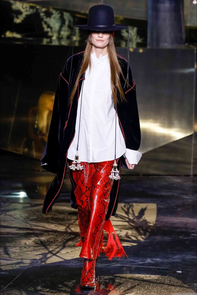 Siluetele sunt largi și curg pe podiumul H & M Studio. În acest sezon, marea noutate este prezența recurentă a imprimeurilor florale și broderiilor inspirate de costumele tradiționale suedeze pe tunici de mătase, cu un efect transparent, pantaloni de catifea și costume etno-chic. Designerii se joacă foarte mult cu garderoba masculină, readucând la viață imprimeul pinstripe și accesoriile gaucho. Hainele de catifea au țesături interesante și culori bogate și sunt revizitate de franjuri, care par obținute din destrămarea broderiilor, au fost, de asemenea, prezente în colecția H & M Studio pentru toamna-iarna 2016-2017.