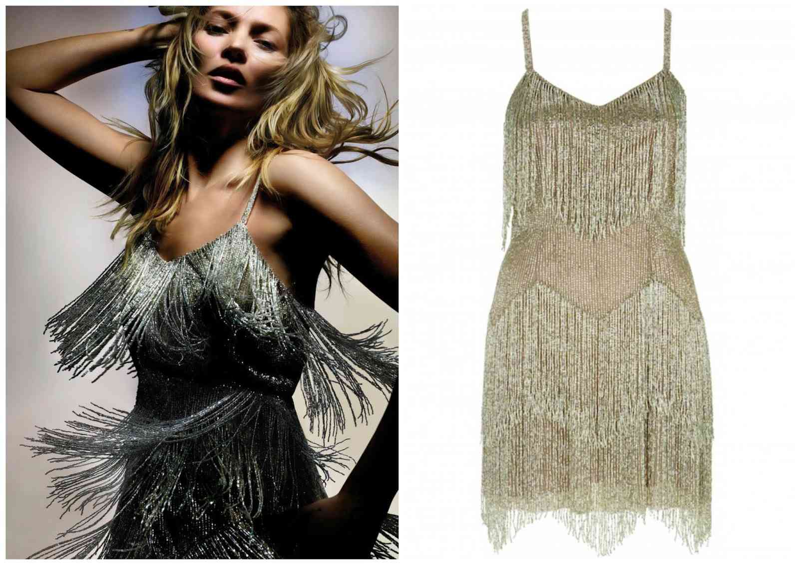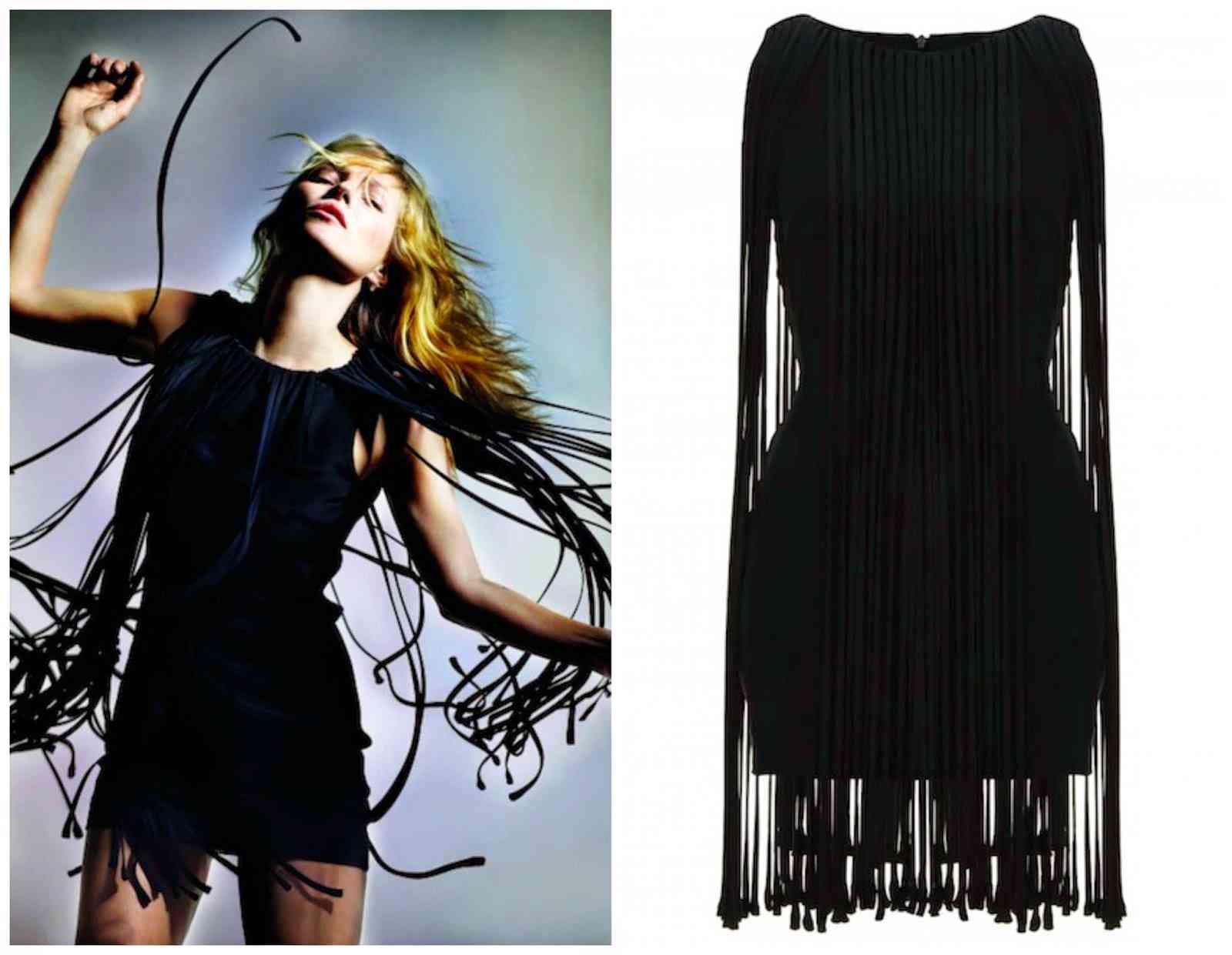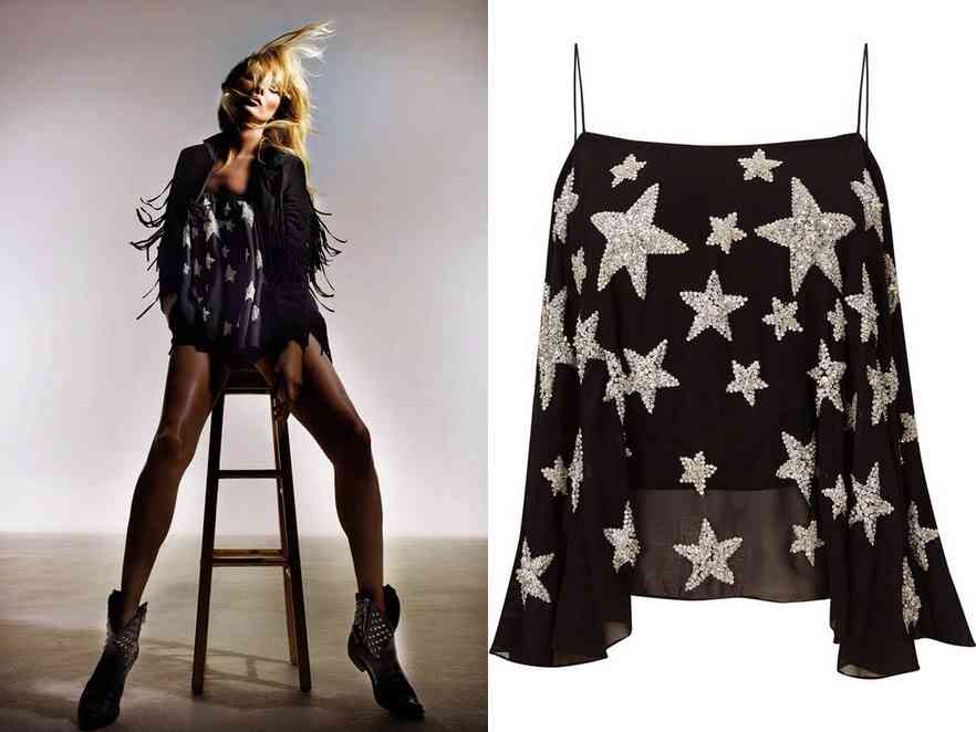 Mergând mai profund în colecția Kate Moss pentru Topshop 2014, vom întâlni unele vibratii și nuanțe spectaculoase și foarte interesante , despre care vom vorbi mai pe larg. Astfel , de la primele articole, se simte înclinația interesantă spre aspectul de petrecere, opțiuni clasice, și un pic de inspiratie boho alternativă. Deci, piesele sunt ornate cu franjuri cool și detalii de argint strălucitoare și forme măgulitoare. O altă alternativă creativă de acest tip poate fi vazută la următorul aspect care are în centrul atenției din nou franjurile, puse cu generozitate ca elemente cheie de design pentru forma de ansamblu . Acesta din urmă vine ca o variantă modernizată a mini-rochiei neagră atât purtată de femei la petreceri și cocktail-uri!