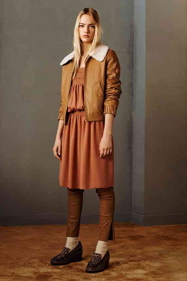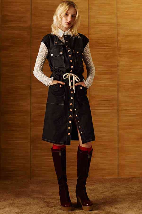 Colecția See by Chloe pre-toamna 2016 este bogată în tricoturi, cizme cu toc înalt, alături de saboți din piele întoarsă și salopete. Observăm că accentul pe denim este puternic, purtat cu cizme maro din piele întoarsă.