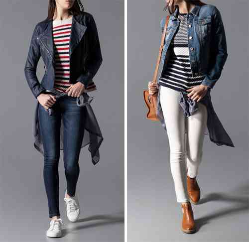 În primul rând, noua colecție Stradivarius pentru primăvara / vara 2015, ne arată diferite linii de îmbrăcăminte exterioară. Jachete de motociclist bleumarin cu fermoar (£25.99) purtate cu tricotaje în dungi (£22.99) în culori multicolore, blugi cu push-up (£25.99) de culoare albastru închis și alb purtate cu adidași albi ( £25.99) care oferă un look chic și rafinat.