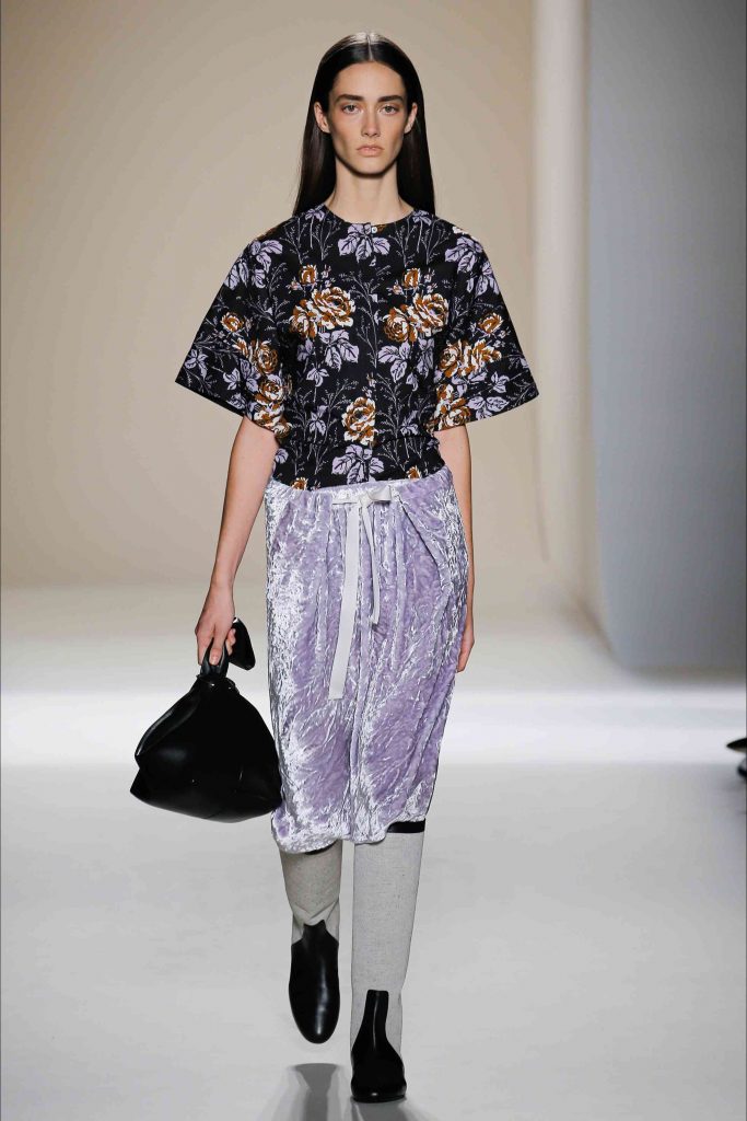 Punctul de vânzare necontestat al colecției a fost culoarea zemoasă. Catifeaua mentă și liliac, pe care ea, de asemenea, a utilizat-o pe genți nestructurate, are o calitate aproape iridescentă, la fel ca rochia tricot portocalie. Pe de altă parte, ea a imprimat pe piele albă motive florale delicate.