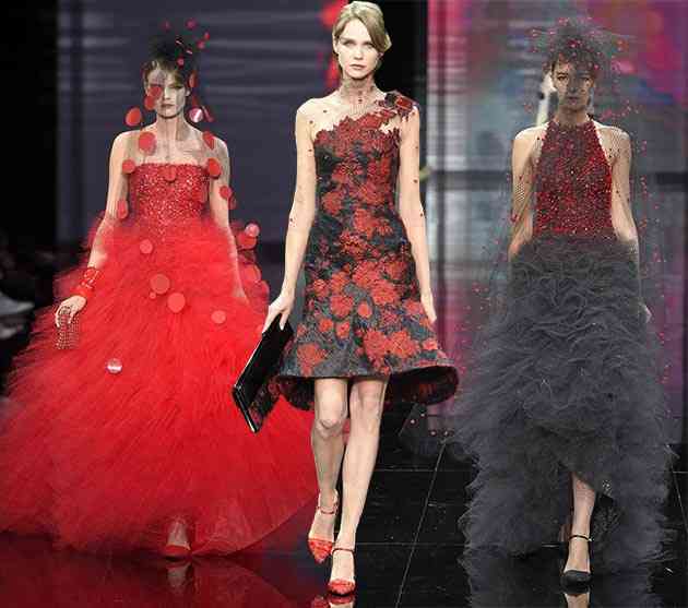 Unitatea de roșu, negru și alb, a servit ca sursă de inspirație pentru o linie couture uluitoare, de neuitat, care vine ca o colecție cu totul uimitoare Giorgio Armani Privé Couture pentru toamna / iarna 2014-2015 prezentată la Paris și care a furnizat celebrităților și doamnelor de peste tot o întreagă gamă de rochii inexplicabil de chic și de neînlocuit pe covorul roșu.