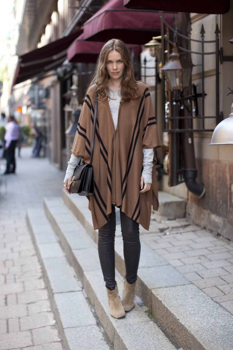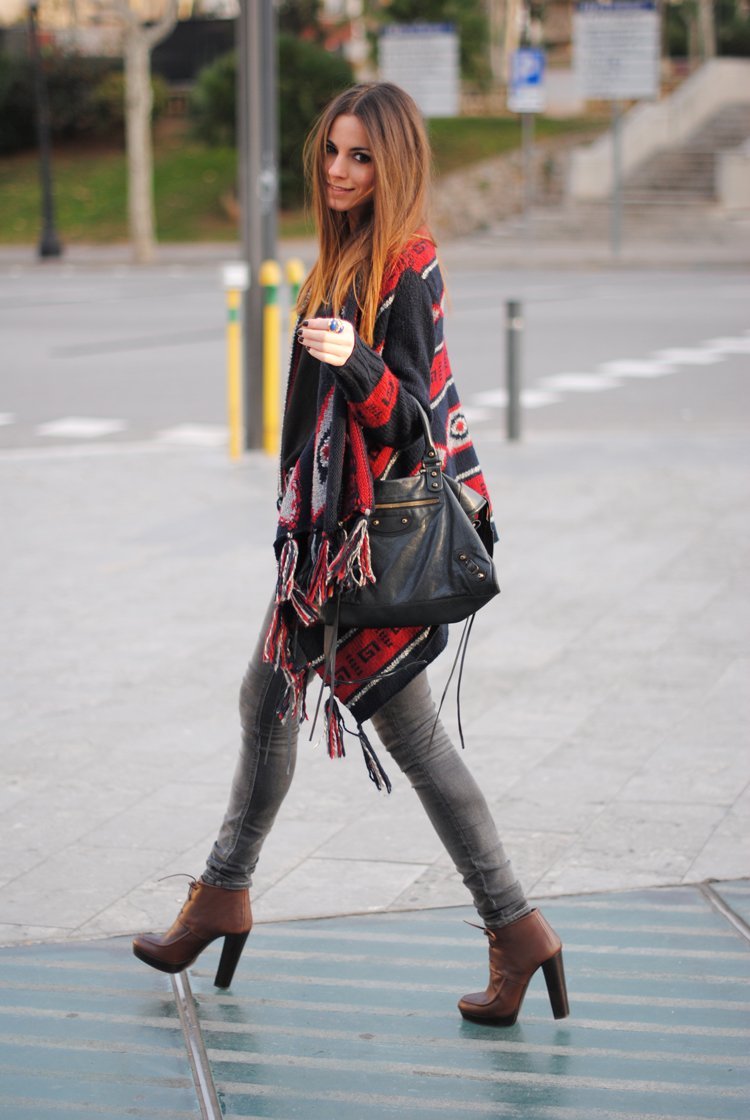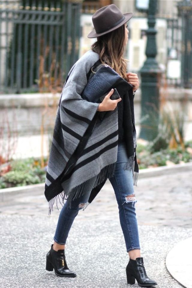 Dacă preferi un aspect casual, cel mai bun mod este să combinați un poncho cu blugi skinnyși tocuri. Cu această combinație veți obține un aspect foarte feminin și sexy. Pentru a evita supraîncărcarea look-ului, vă recomandăm să luați o mică geantă de mână pentru a completa ținuta.