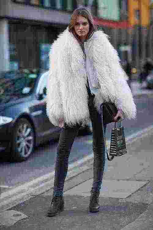 Pentru un look ofisticat. Purtați o haină de blană cu rochii glamour, cizme, pantaloni de piele, pulovere chunky, tocuri, pălării, blugi, căciuli, topuri scurte.
