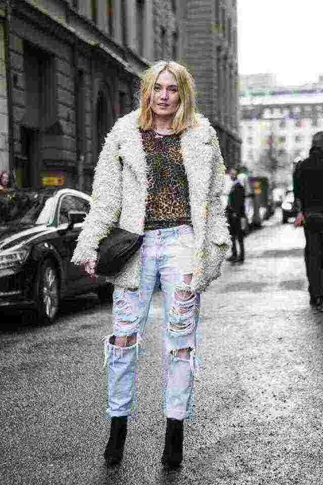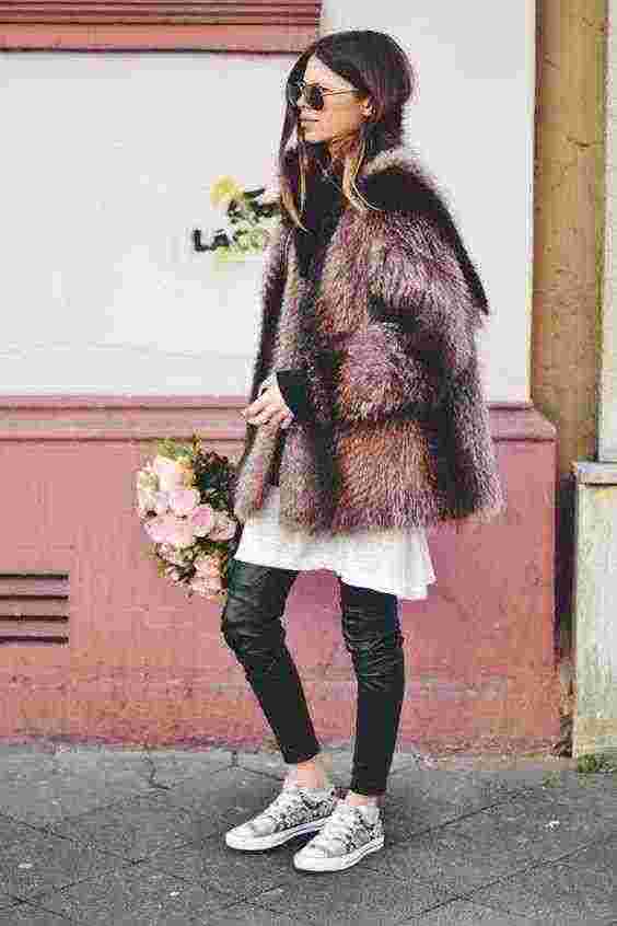 Pentru un look casual. Acesta este cel mai simplu look de obținut. Purtați o haină de blană cu blugi boyfriend, adidași, cizme, pantaloni de trening, îmbrăcăminte sportivă, șepci de baseball, pulovere, jachete, tricouri.