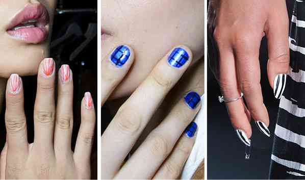 Ca și în articolele de îmbrăcăminte, dungile sunt populare pentru unghii, de asemenea, prezentate cu o mare varietate de opțiuni, de la tipuri de carouri verticale la cele orizontale. Aceste opțiuni pot fi găsite la Christian Siriano, Emerson, Kye, Mara Hoffman, Zimmermann, Cushnie et Ochs și Manish Arora. Un design spectaculos a fost introdus de curând de Choi Jin, care a fost inspirat de călătoriile nomade ale anilor douăzeci. Astfel, simbolul „în regulă”, a fost construit cu două dungi orizontale și una verticală pe cele trei degete centrale.Umbra fondului a fost selectată pentru a fi albastru-gri, iar dungile au fost întocmite de tonurile de gri-negru. Aceste opțiuni sunt deosebit de populare printre opțiunile prezentate de Kate Spade și Kenzo, de exemplu, care chiar au optat pentru aceste finisaje ascuțite.