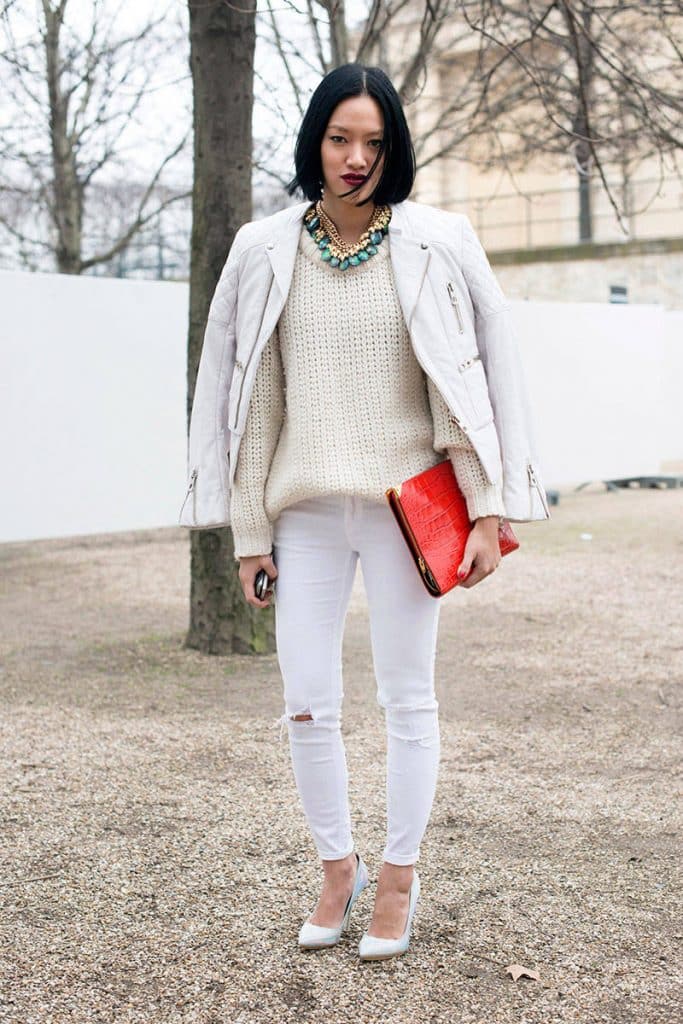Când ne gândim la blugi albi, vară, soare și piele bronzată sunt, probabil, primele lucruri care ne vin în minte. Dar … cine spune că blugii albi se poartă de regulă doar în timpul verii? Nimeni nu știe, dar ne bucurăm de regulă atunci când vine vorba de modă, așa că ne-am decis să purtăm blugi albi acum că temperaturile sunt sub zero grade. Imaginează-ți asta: toată lumea poartă negru sau gri, și tu vei purta alb. Superb! Și dacă ai purta blugi albi cu o culoare strălucitoare? Chiar mai extravagant! Poartă-i cu o căciulă sau un guler de blană, și gata!
