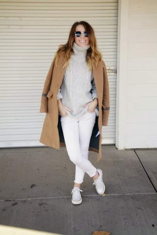 Cel mai bun mod de a purta blugi albi toamna și iarna este stratificarea. Blugii skinny albi arată absolut uimitor atunci când sunt cuplați cu un pulover supradimensionat și un palton, cu tocuri sau cizme. Atunci când alegeți paleta de culori corectă pentru a merge cu blugi albi, nimic nu funcționează mai bine decât nuanțele de toamnă. Un pulover maro mut cu un palton camel pe partea de sus este o combinație superbă. Aceste nuanțe funcționează perfect iarna. Acestea fiind spuse, nu trebuie să rămânem întotdeauna la paleta de culori de iarnă. De asemenea, puteți opta pentru nuanțe de gri și pasteluri care se potrivesc cu tonurile de gri.
