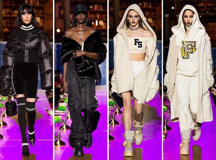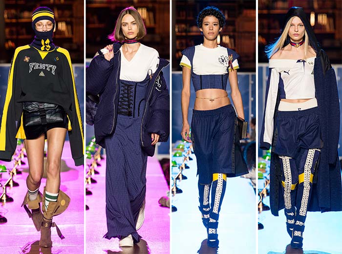Spiritul american de colegiu vine la viață în această colecție Fenty x Puma pentru toamna-iarna 17-18, proiectată de Rihanna. Starul pop decide să programeze show-ul seara târziu, în a șaptea zi a Săptămânii Modei de la Paris, la Biblioteca Națională a Franței. Sub ochii atenți ai oaspeților, inclusiv Cara Delevingne și Salma Hayek, modelele au defilat pe mesele din lemn vechi ale bibliotecii, purtând jachete maxi, jachete XXL, rochii-cămașă, rochii tartan și pantaloni cargo într-un amestec de sport, stil de stradă și ghetou.