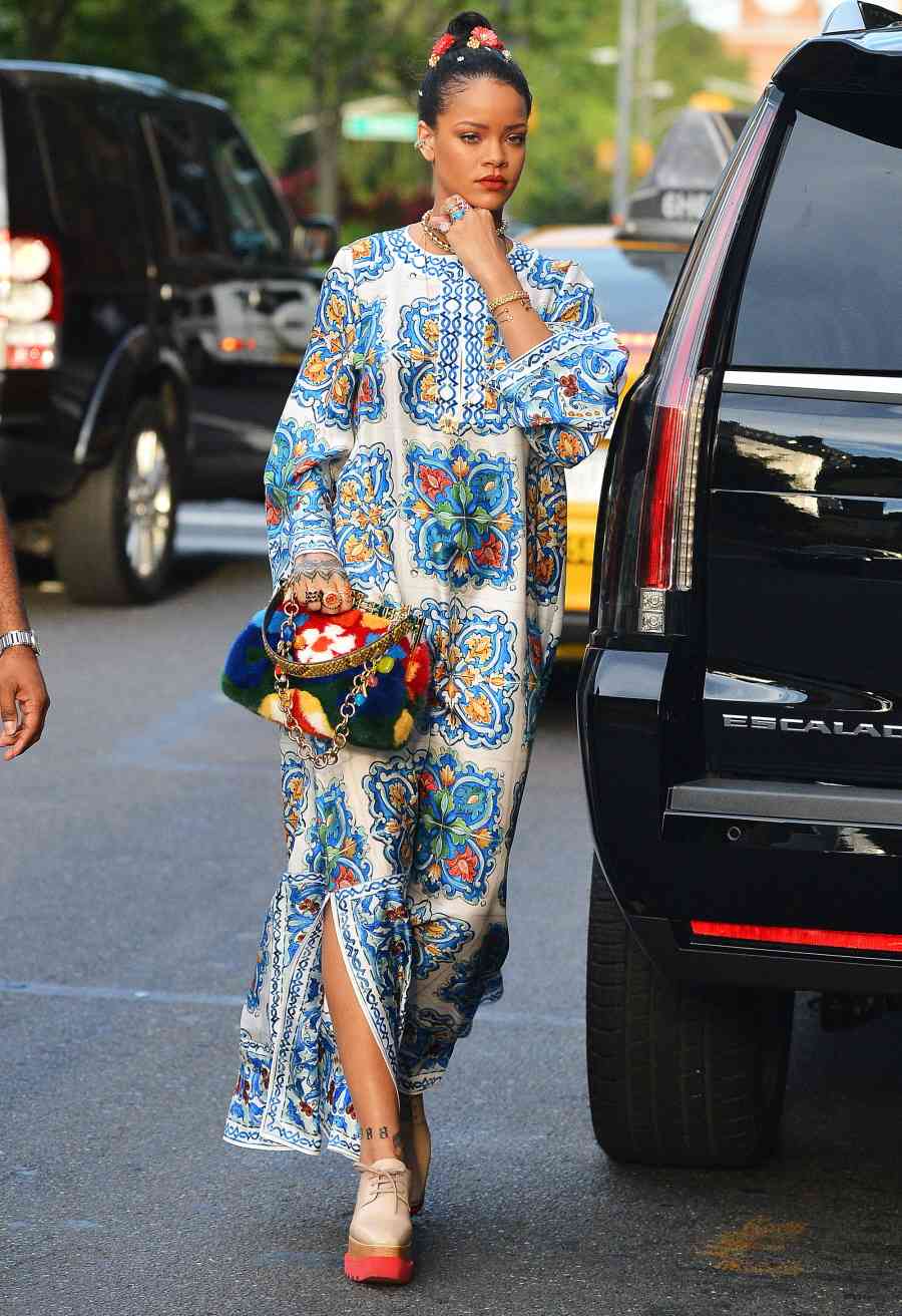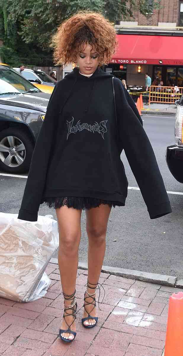 Starul pop din Barbados reușește de fiecare dată să capteze atenția paparazzilor datorită aspectului său de stradă: o jachetă de inspirație militară Rodarte combinată cu topuri scurte și adidași Puma sau chiar blugi rupți purtați cu pulovere maxi și genți IT (de câteva luni este noua față a genților Diorama by Christian Dior).