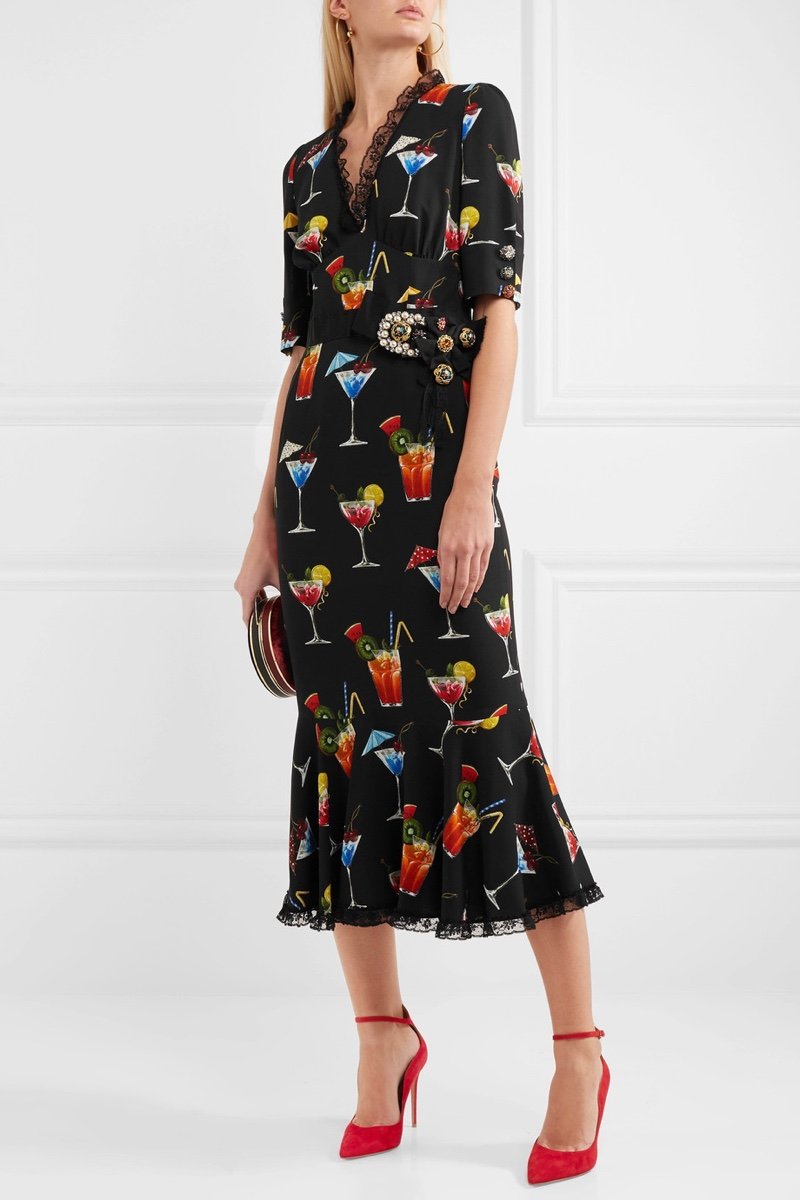 În ciuda fructelor, colecția în sine pur și simplu nu pare toată tropicală. Unele dintre simbolurile Dolce & Gabbana folosite pentru a face referire la această regiune sunt jachete de fanfară, coroane folclorice, pantofi și pizza, paste, cocktailuri și înghețată, motive pe care le-am simțit un pic aleatorii – deși au făcut un festin vizual vesel când au apărut pe pistă, și ce mai vrei de la un spectacol Dolce & Gabbana?