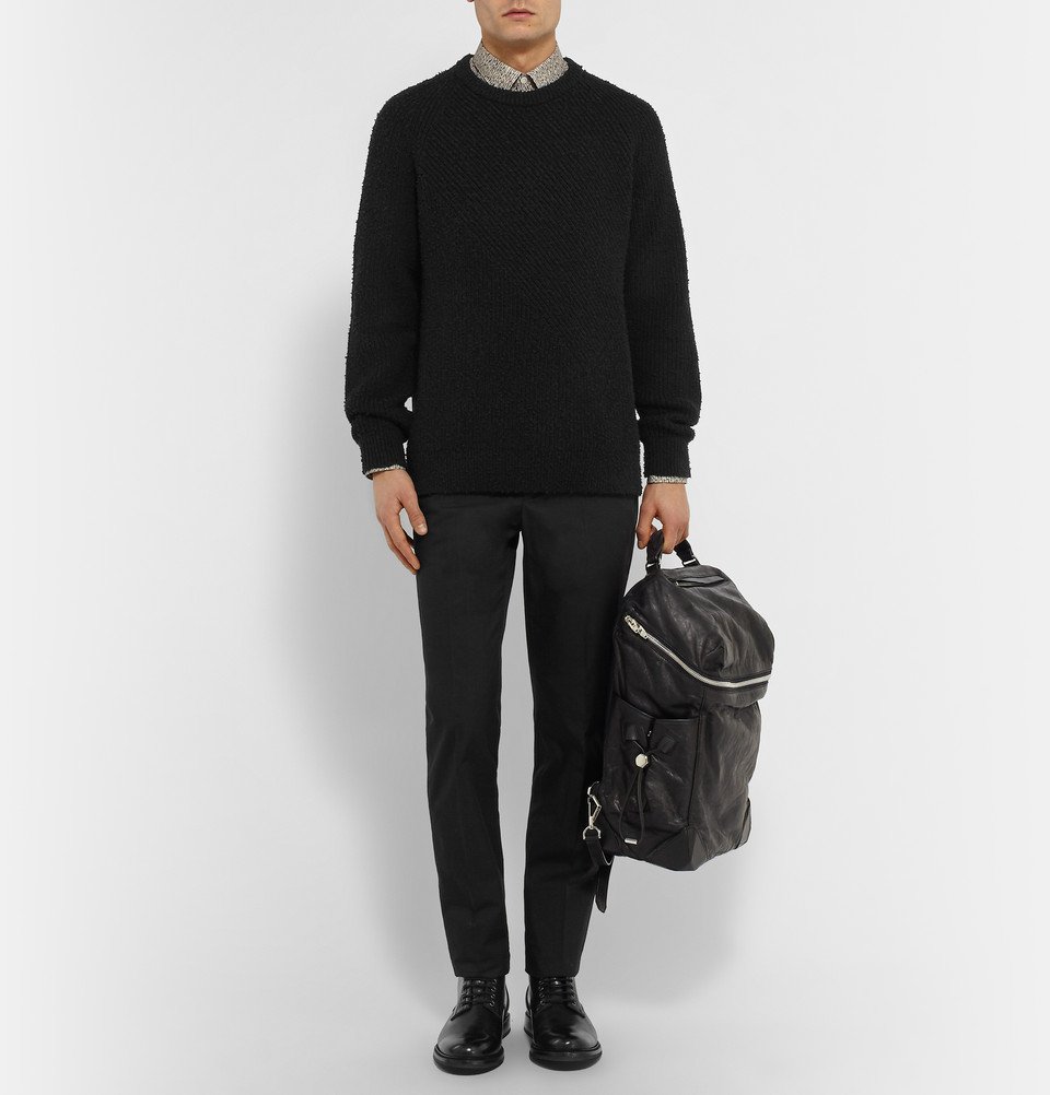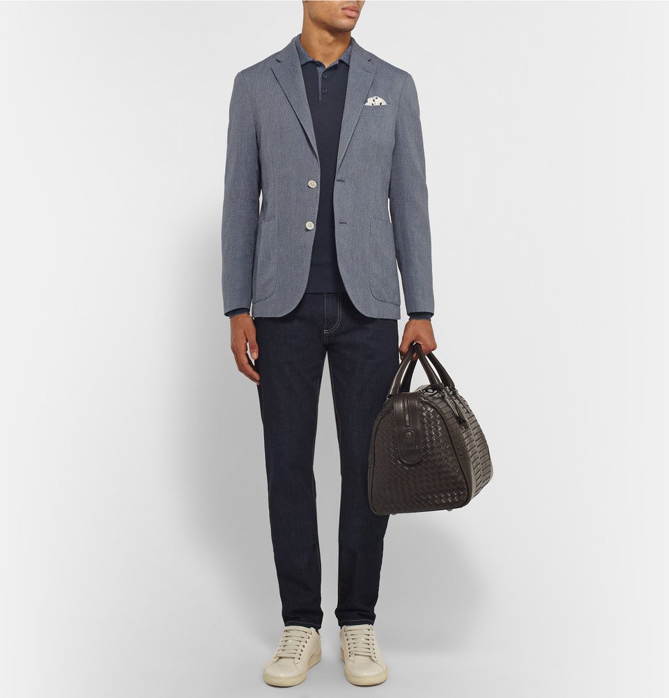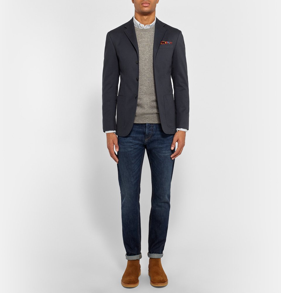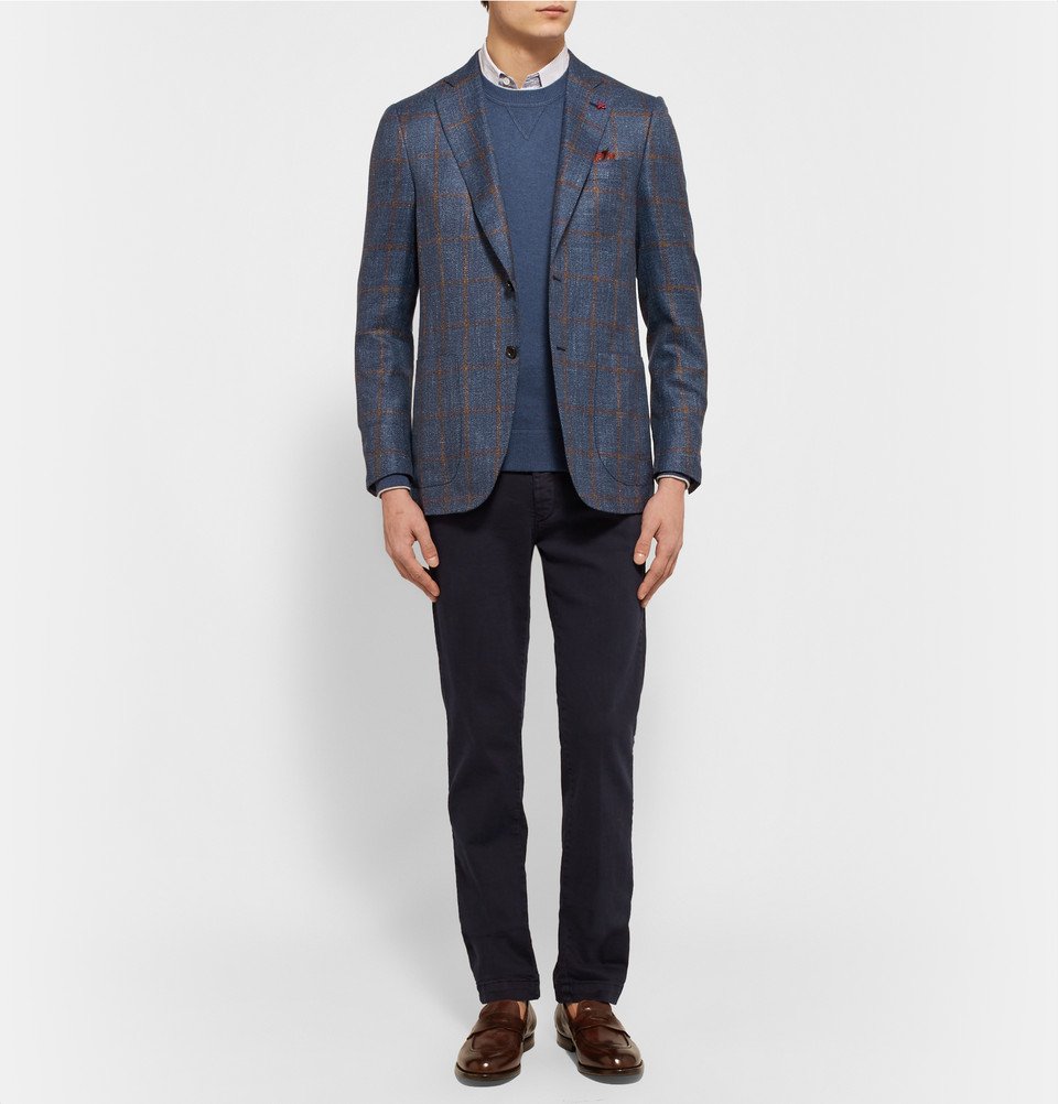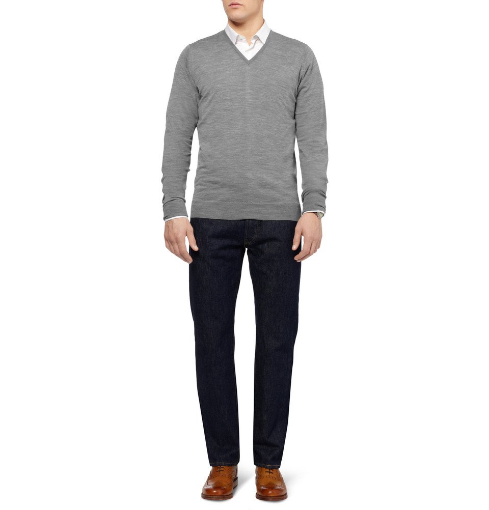 Sacou și pulover. Cea mai interesantă propunere pentru vinerea casual este puloverul sub sacou. Este un aspect versatil, confortabil și ușor de reprodus. Pantoful clasic din piele cu șiret este înlocuit cu unul mai casual, chiar de piele întoarsă.
